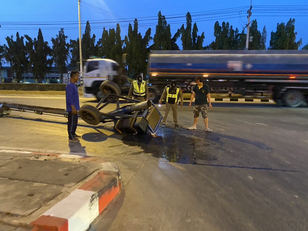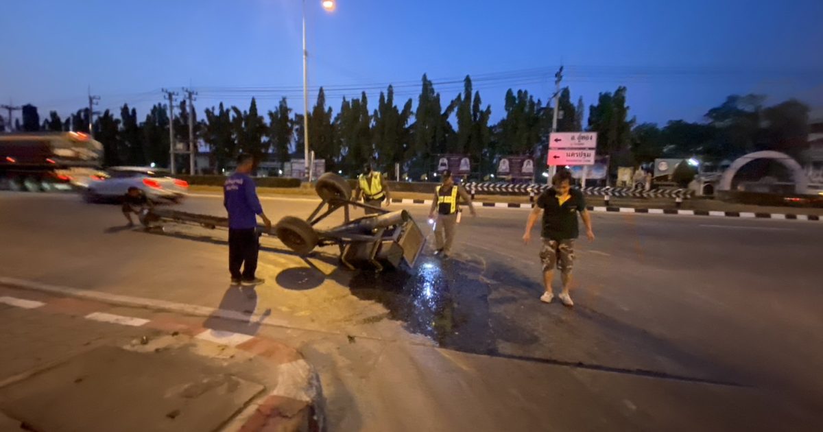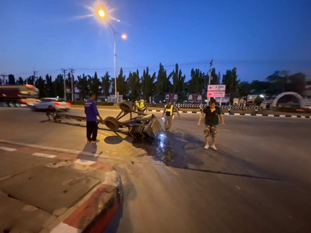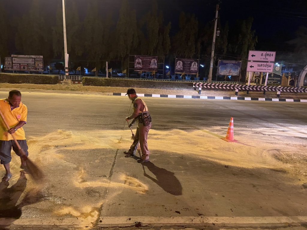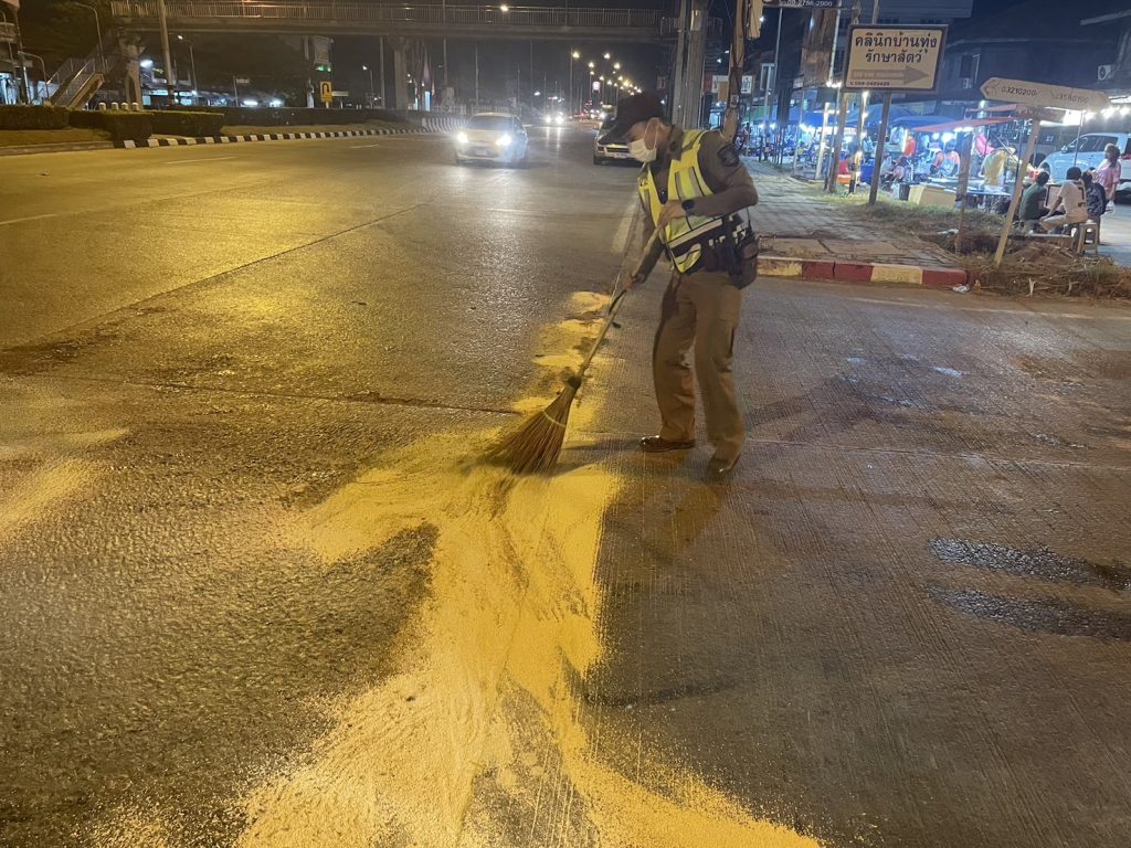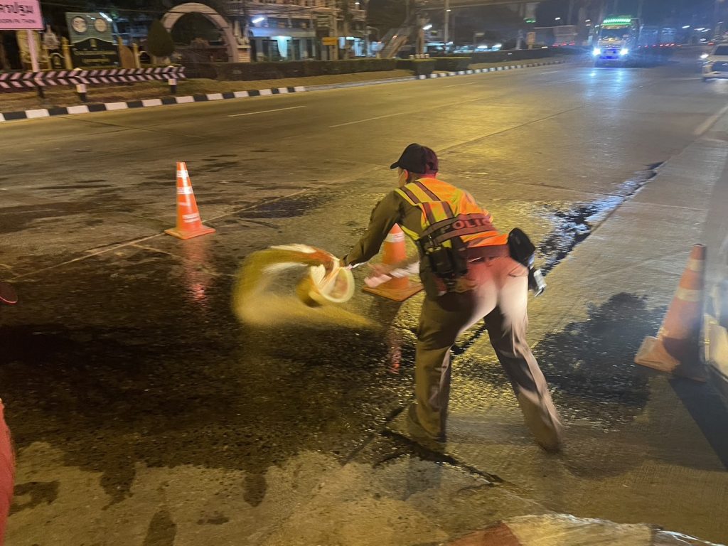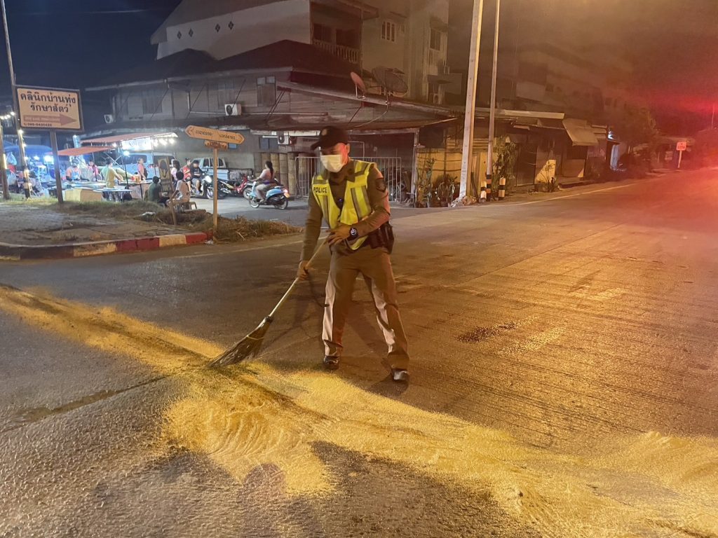 ช่วยเหลือประชาชน เครื่องสูบน้ำคว่ำบริเวณน้ำมันไหลลงบนถนน ทางแยกเข้า สภ.ทุ่งคอก