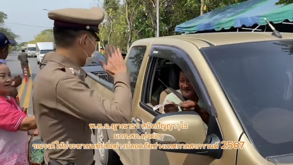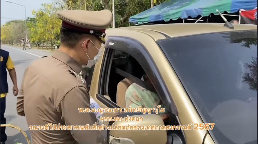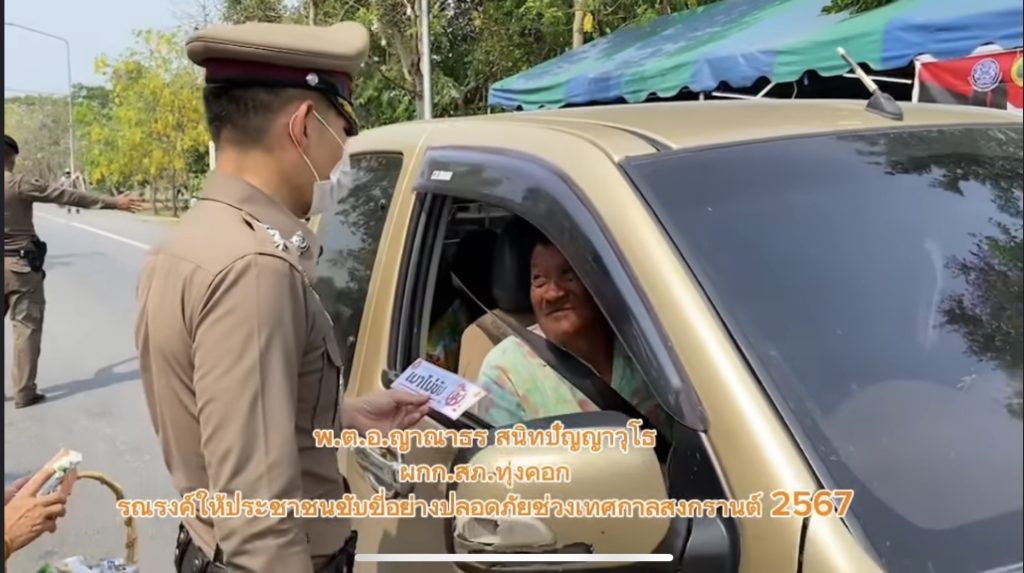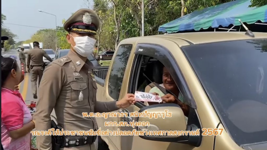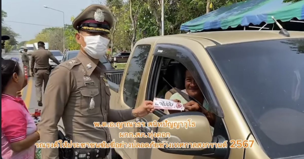 มอบสติ๊กเกอร์และรณรงค์ให้ประชาชนขับขี่อย่างปลอดภัยช่วงเทศกาลสงกรานต์ 2567 บริเวณ จุดตรวจชุมชนหน้าอบต.ทุ่งคอก