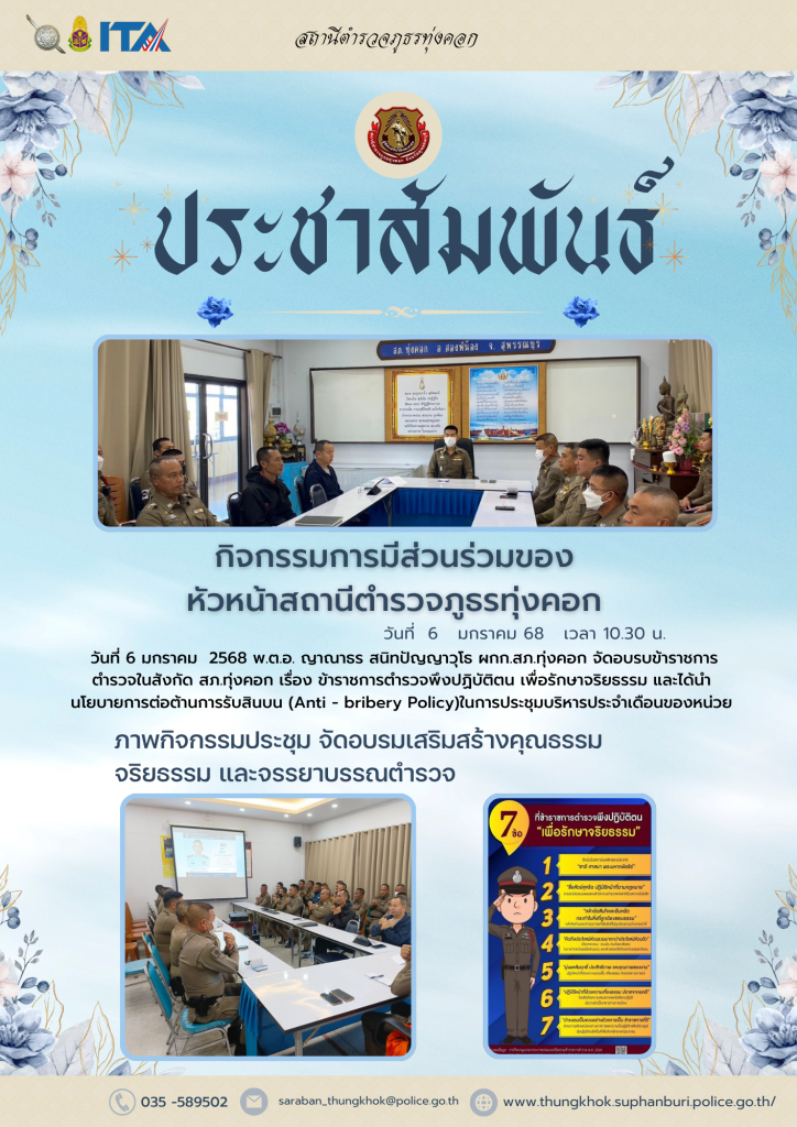 ผกก.สภ.ทุ่งคอก จัดให้มีการอบรม เสริมสร้างคุณธรรมและความโปร่งใสโดยเน้นย้ำการต่อต้านการรับสินบน (Anti – Bribery Policy) งานป้องกันปราบปราม