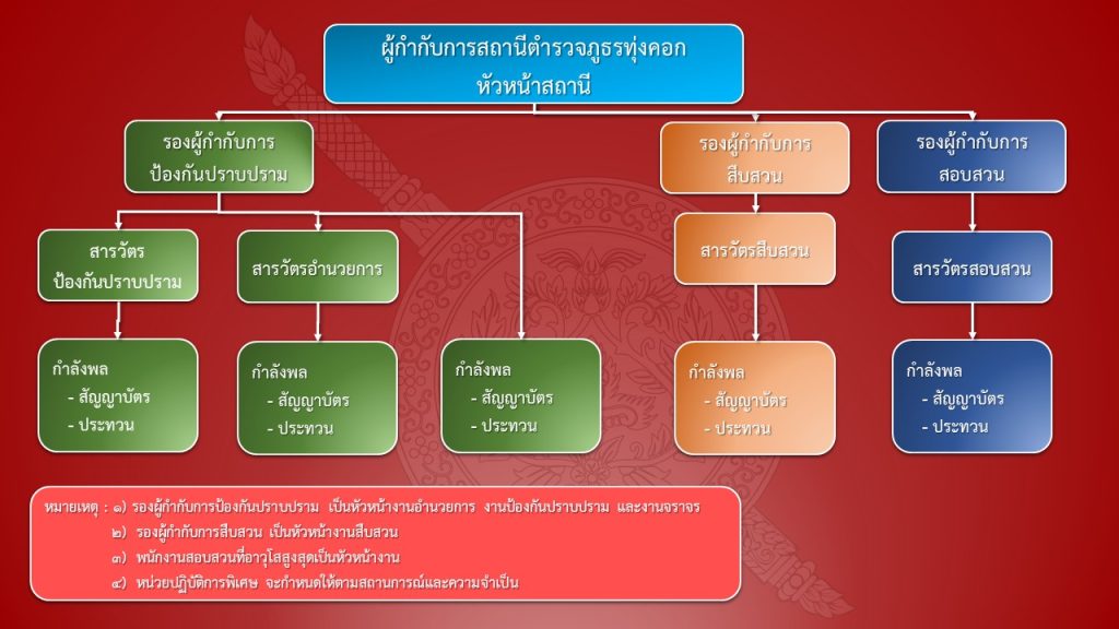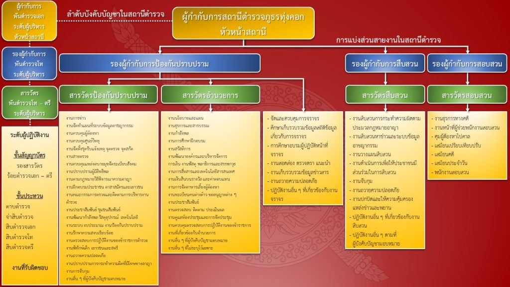 มีหน้าที่เกี่ยวกับการวางแผน อำนวยการ สั่งการ ควบคุม กำกับ ดูแล ตรวจสอบติดตามและประเมินผล ตลอดจนปฏิบัติงานในด้านการป้องกันอาชญากรรมและรักษาความสงบเรียบร้อยงานคณะกรรมการตรวจสอบและติดตามการบริหารงานตำรวจ งานชุมชนและมวลชนสัมพันธ์ในรูปแบบต่าง ๆ รวมทั้งงานที่มีลักษณะเกี่ยวข้องหรือเป็นส่วนประกอบของงานนี้ เพื่อมิให้เกิดอาชญากรรมขึ้นในเขตอำนาจ การรับผิดชอบหรือพื้นที่ปกครองของสถานีตำรวจ