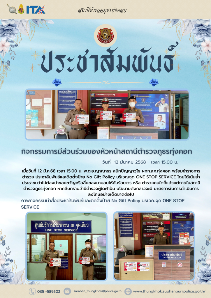 ผู้กำกับการสถานีตำรวจภูธรทุ่งคอกประชาสัมพันธ์และติดตั้งป้าย No Gift Policy บริเวณจุด ONE STOP SERVICE